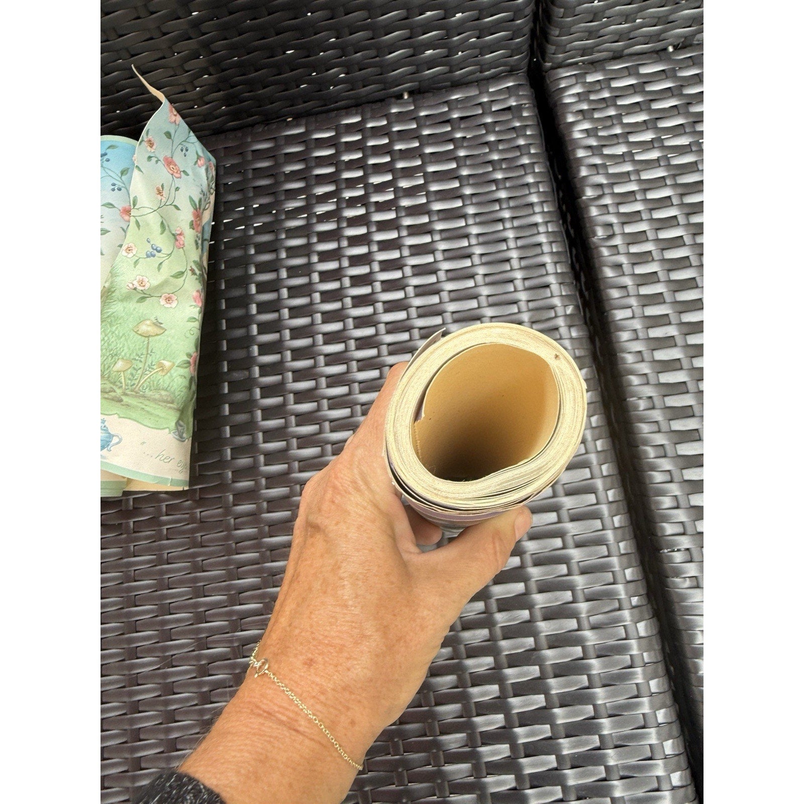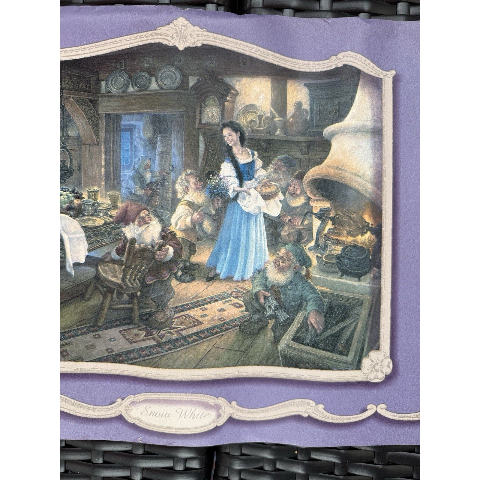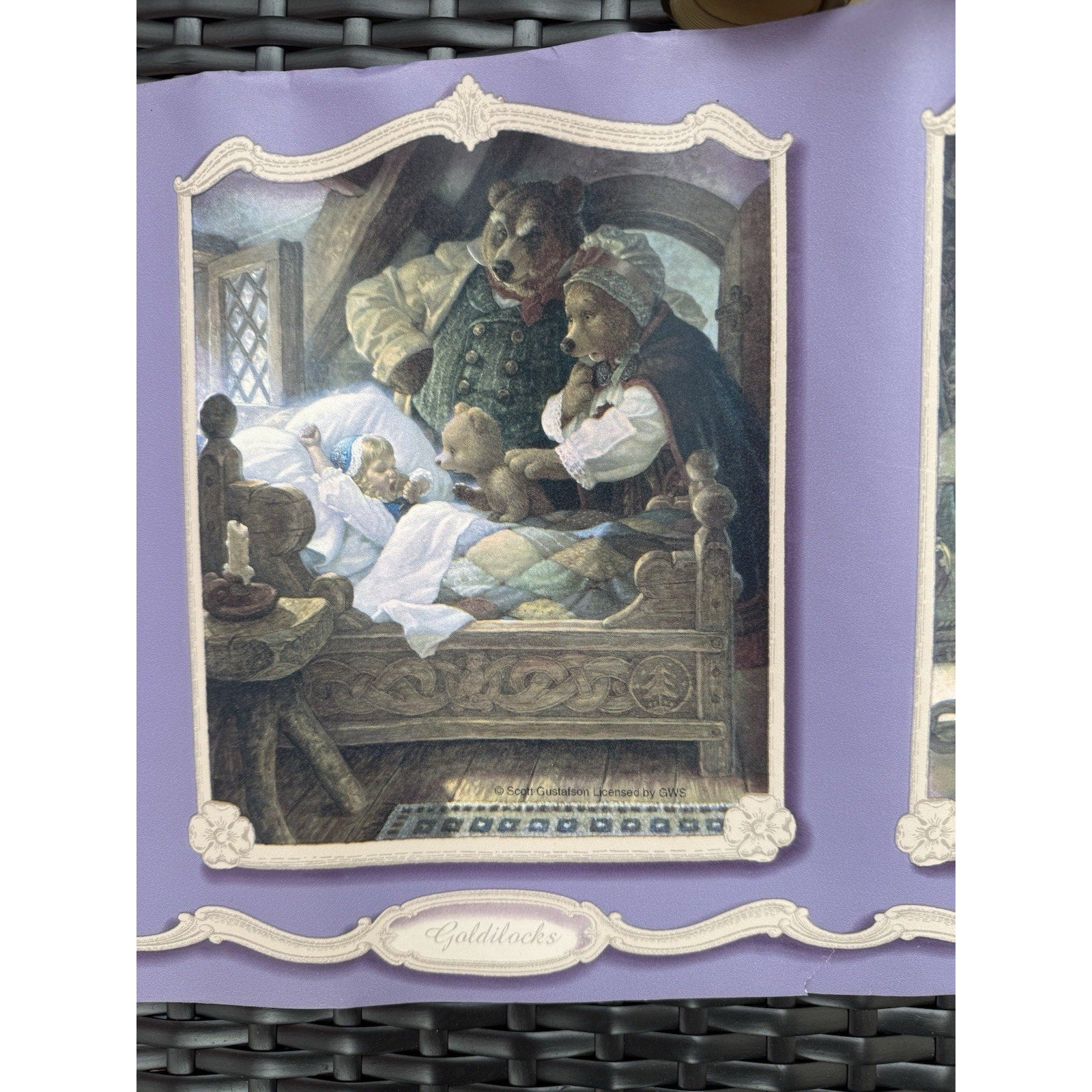 Discontinued Fairy Tale Wallpaper border. Warner Co., Book "Fairy Tales", # WF103413, Scott Gustafson design, 10 1/4" width, 27" repeat, 15 feet length. Coordinating wallpaper WF204036, WF204006.