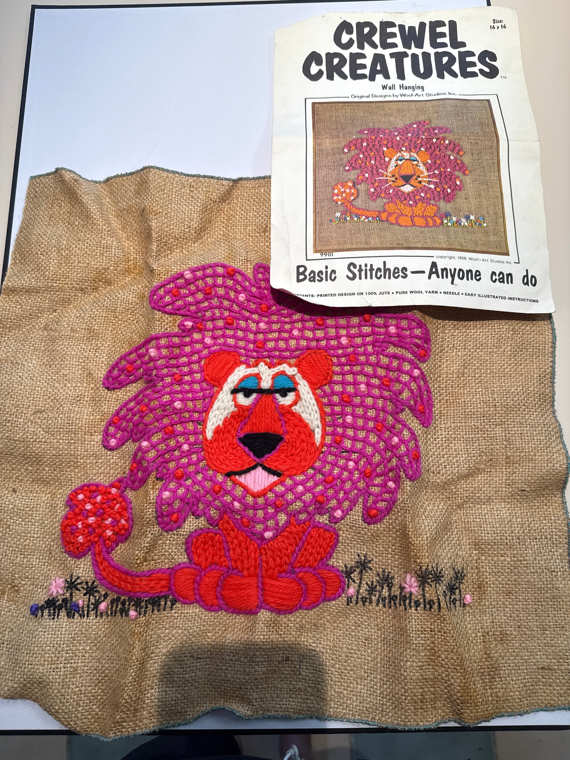 vintage crewel kit, unfinished embroidery, 1960s craft kit, retro wall hanging, midcentury decor, lion embroidery, crewel creatures, DIY embroidery kit, wool-art studios, vintage needlework